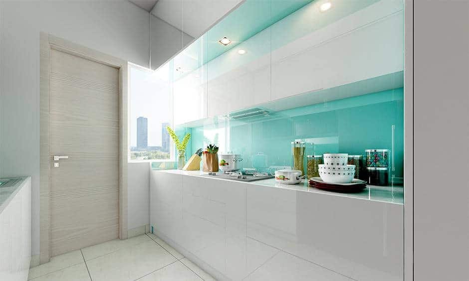 Dažytas stiklas virtuvėje dažnai pasirenkamas kaip alternatyva plytelėms.